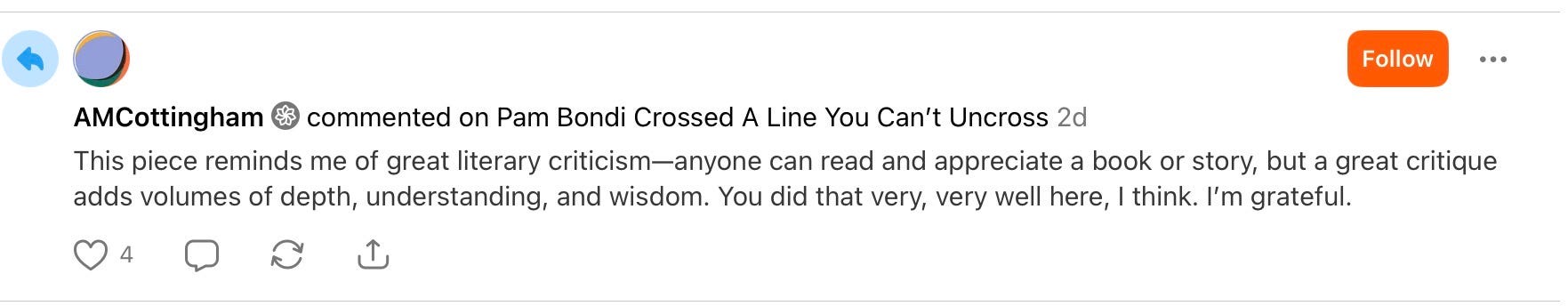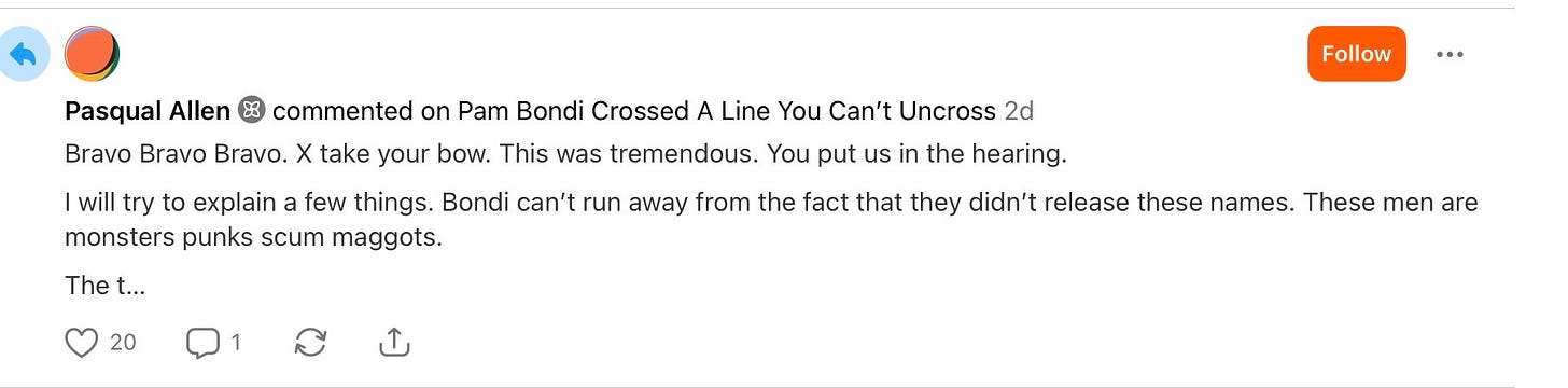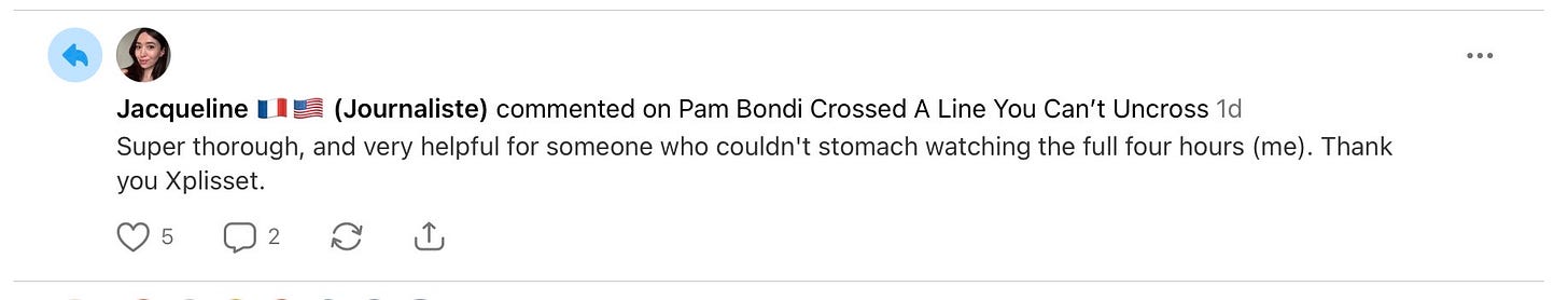 Here’s the point I want to make plain as day. This newsletter does reporting on par with mainstream outlets, and my Pam Bondi write-up is a perfect example of that.