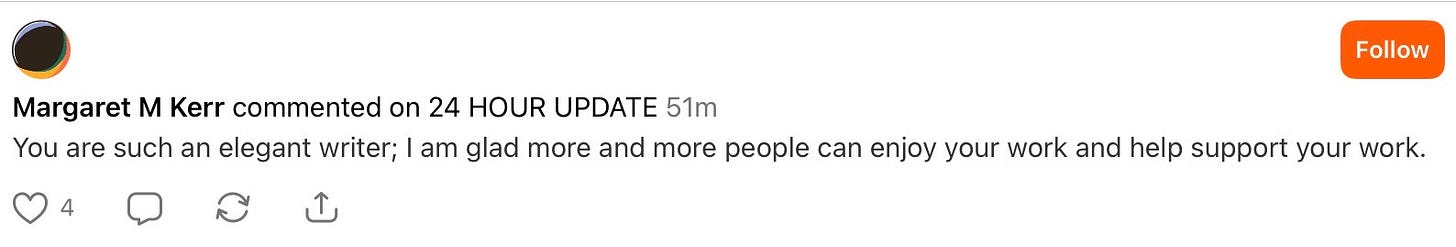 We’ve added 11 new paid subscribers in a day. No definitely not “fireworks and confetti” territory, but absolutely “okay…we’re moving” territory. And to everyone who chipped in on Cash App: thank you. That one-time support matters more than you know. Thank you to everyone past and present who have contributed. Thank you even to the free subscribers who keep my stats juiced just enough to keep me in the algorithm’s limelight.