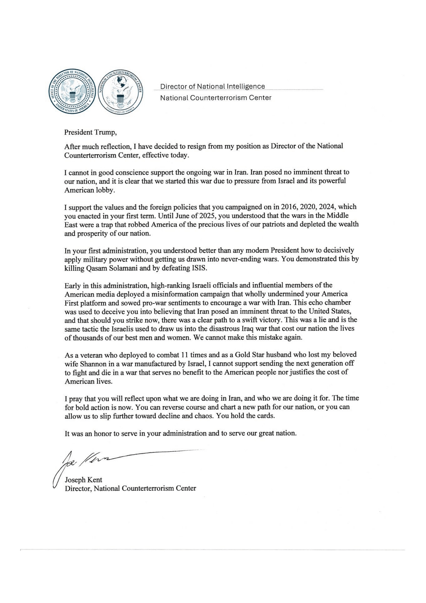 Top counterterrorism official Kent resigns over Trump’s Iran war, says Iran posed no imminent threat - AP reporting that confirms Kent’s resignation language and the broader administration response.