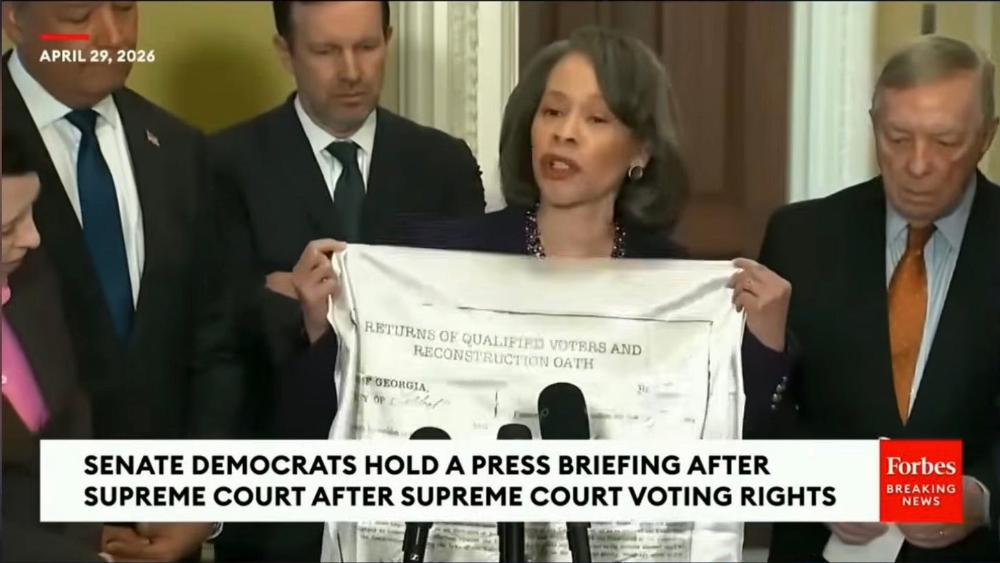 “Thank you, Leader Schumer. I stand before you as a member of the Senate and also a member of the Congressional Black Caucus. This day, when we got the news, I don’t think I knew how the day was going to start. I typically in the past have carried a scarf with me that I carried on the day I was sworn into the House and I carried on the day that I was sworn into the Senate. It allowed our great, great, great grandfather to have the right to vote who had been enslaved in Georgia. And for some reason, I brought it today. He could not read or write. He had to sign an X at the bottom. This is the returns of qualified voters and reconstruction oath from 1867. This document to me is representative of what we are trying to do here today. We are trying to live up to the ideals that were mentioned 250 years ago. That’s what this represents to me. And so today, standing here with my colleagues, our goal is to make sure America knows that we will march, mobilize, organize, pursue, go on the floor, stay up at 2 in the morning, 3 in the morning to stop things like the same back because this is a coordinated effort and we are coordinated as well. I was four years old when the Voting Rights Act was signed into law. I did not think that I would have to be here defending it, but we will. We must. And so thank you, Leader Schumer, for your leadership. Looking forward to working with my colleagues. And we do this for America.” [7]