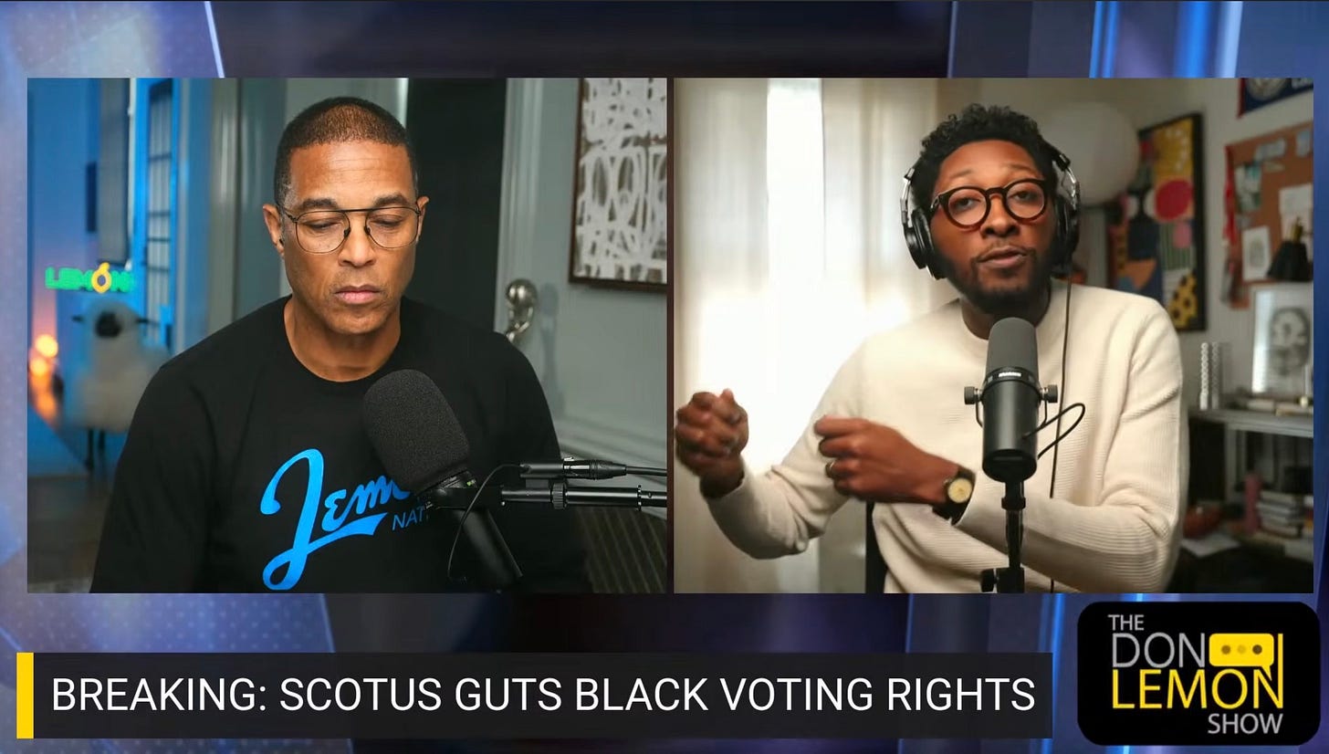 “No, I agree with you. It is the, I posted this yesterday on threads, that this is the worst day, one of the worst days for Black political power in American history. America was not a democracy until the Voting Rights Act. The Voting Rights Act is the thing that destroyed, that defeated, that tore down Jim Crow. And to erase that sets us back at least 60 years. But I recognize that this isn’t the only, that we were building political power over time. You recognize that, you know, the defeat of segregation was many years before that. And so we’re in a moment where they are rolling back not only our access to the ballot, but they have been systematically chipping away at our access to higher education, to our inclusion in the workforce. And so this moment is, it should infuriate everyone who is interested in a multiracial democracy. But I’ll be honest with you, Don, I am, I am waiting for more people to be upset about this. I’ve seen you talking about it. I’ve seen other Black folks talking about it. Thank goodness The Times talked about it this morning on The Daily. But I’m waiting to hear from a few more people who have been pretty quiet about this particular issue over the last 24 hours. We are living in perilous times, and I hate to be the person that sounds like I’m saying the sky is falling, but the sky is actually falling in America right now, and it needs to be said.” [11]