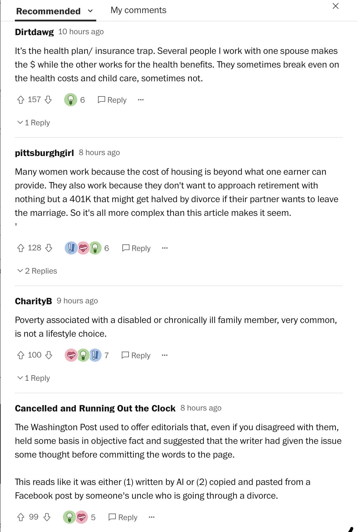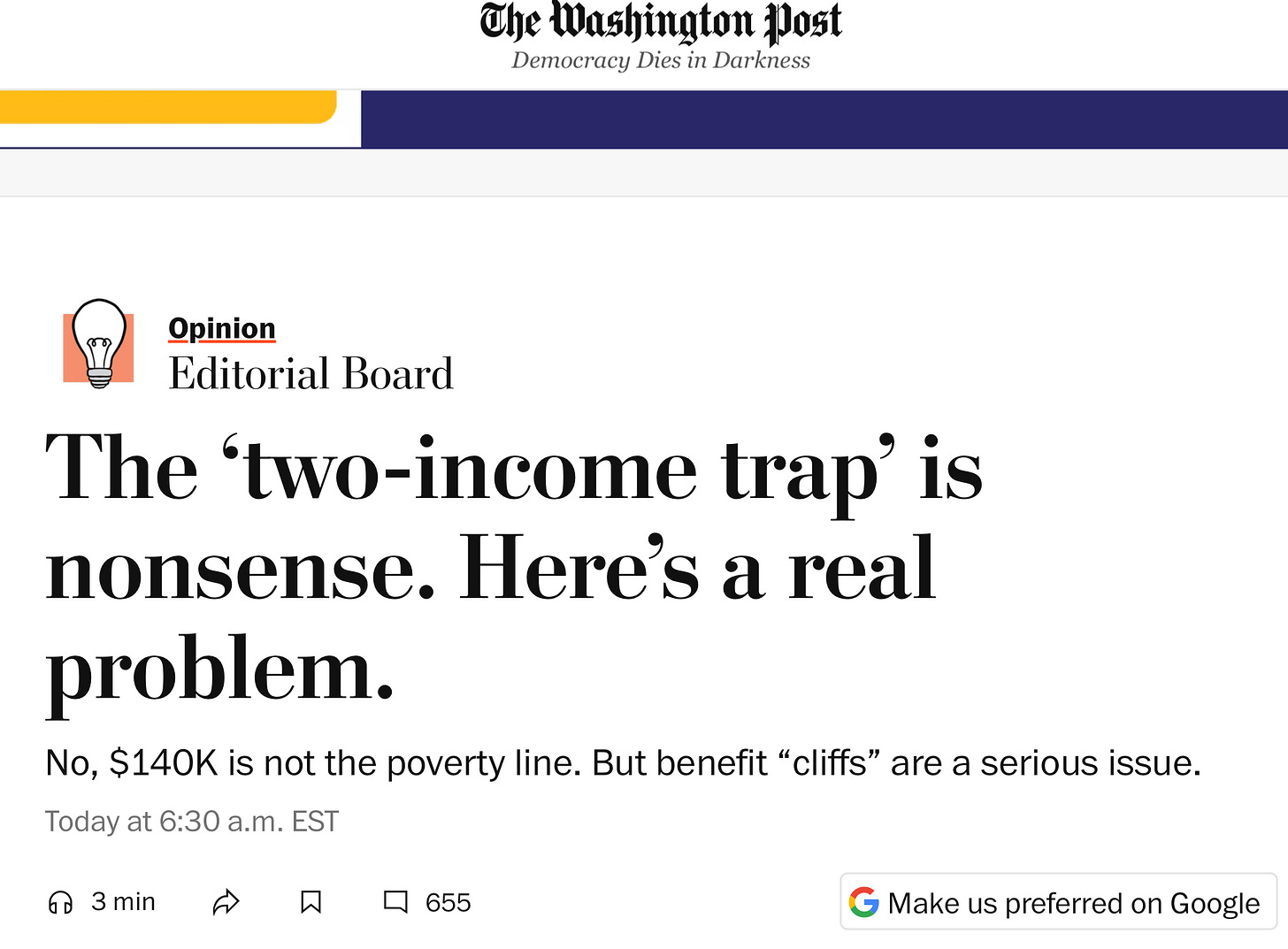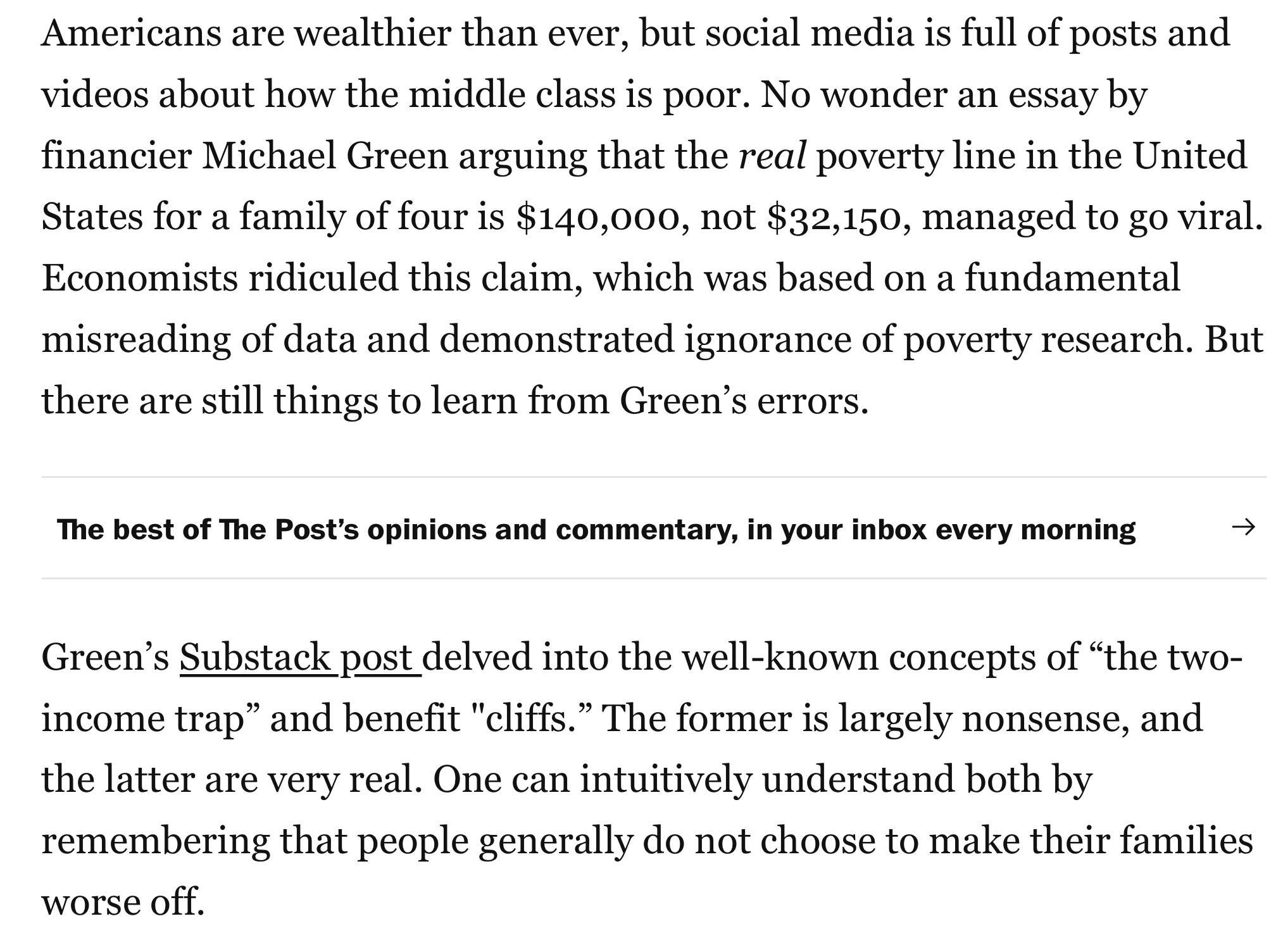 The Post’s response, which I’ll call the “two-income trap is overblown” piece, does not really engage that math. Instead, it uses Green as a cautionary tale about “flashy commentary” that misreads data, pats itself on the back for knowing poverty research, and reassures readers that the real problem is limited to “poor, working families,” not the broad middle he is talking about. In other words: relax, the benchmarks are fine, and if you feel like you are drowning at seventy, eighty, or ninety grand, that is a vibes issue, not a numbers issue.