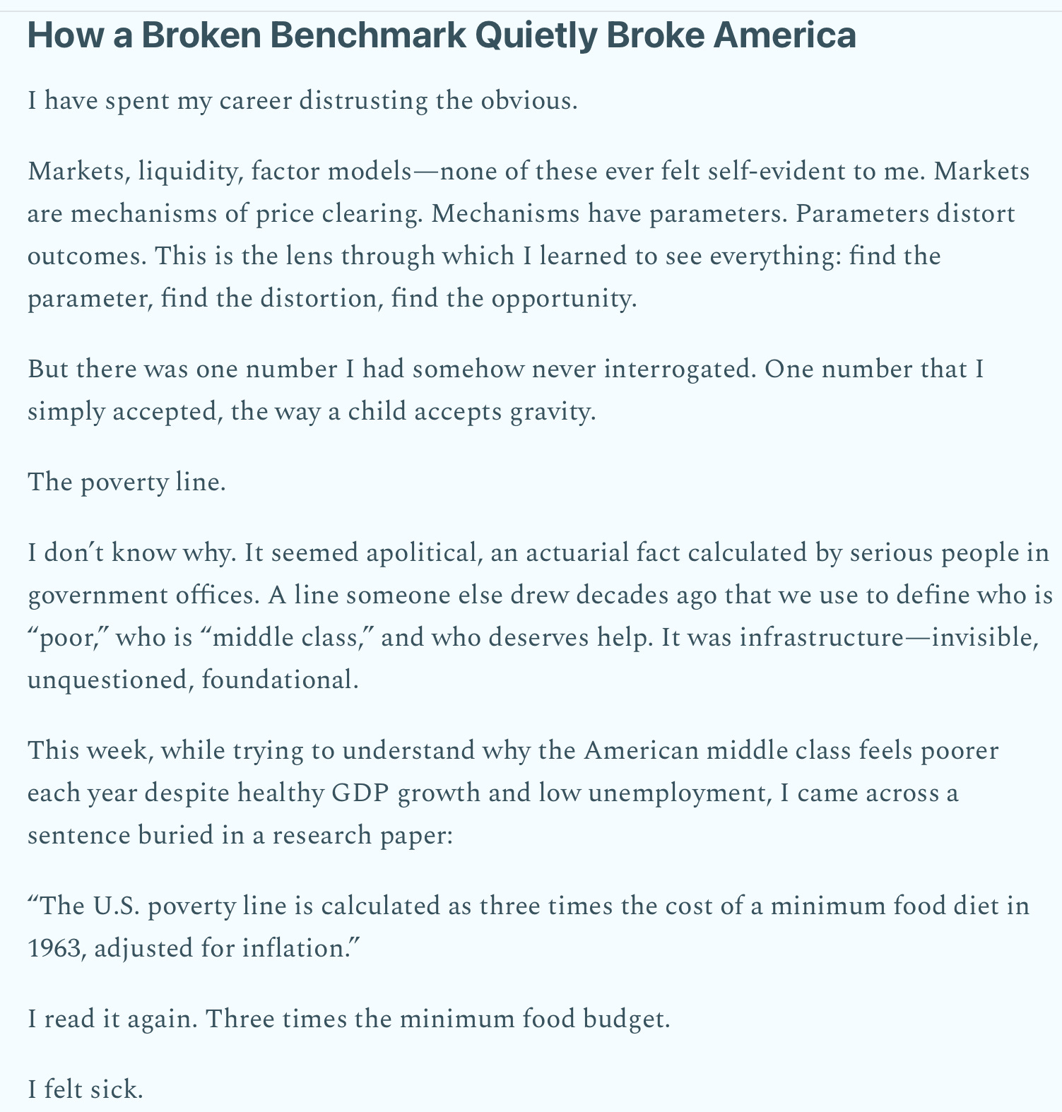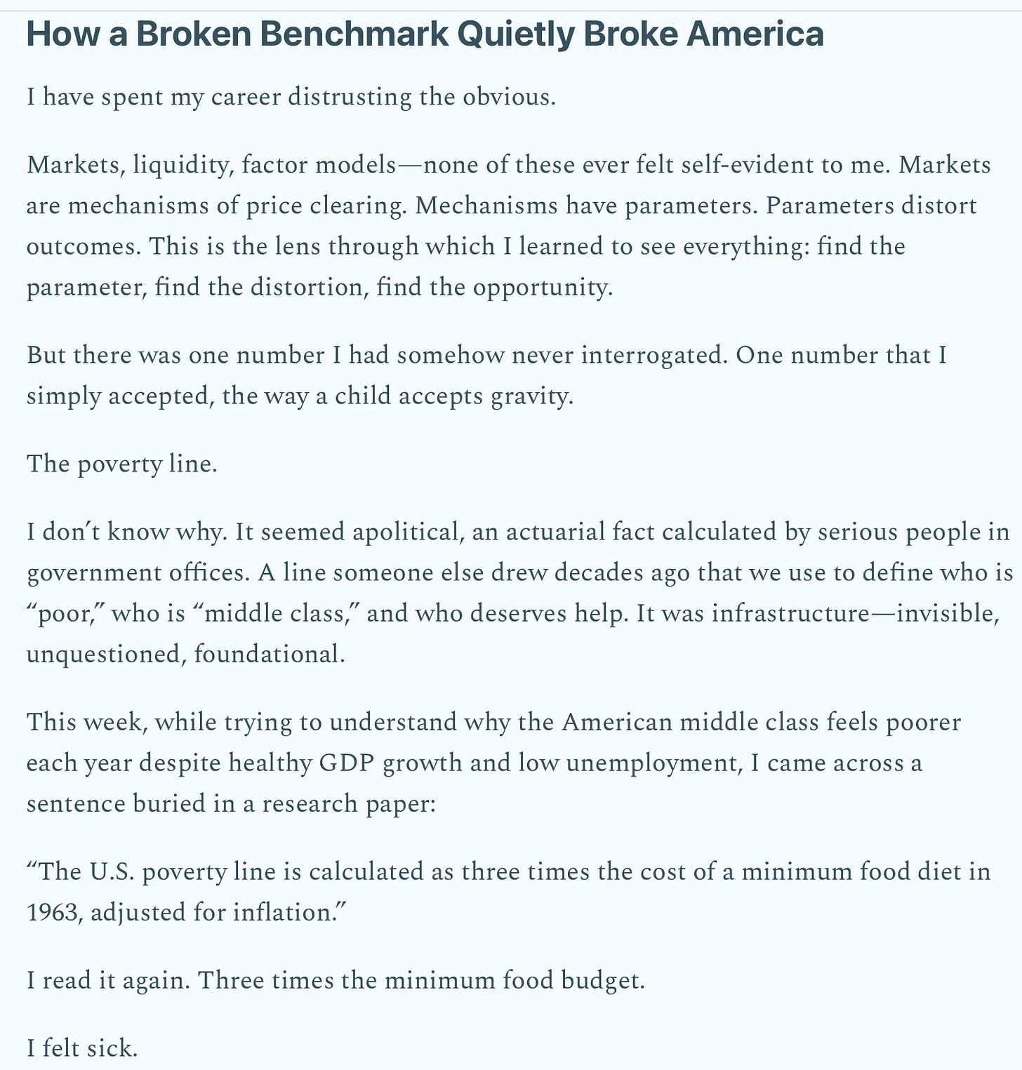 If you missed Green’s piece, here’s the one-sentence version: he went back to the original 1960s poverty formula, applied the same logic to today’s actual cost of participation (housing, childcare, healthcare, transportation), and came away with a blunt conclusion. For a family of four, the real “too little to function” line is not thirty-one thousand dollars. It is somewhere around one hundred forty thousand. In his words, most of the “middle class” is actually the working poor, stuck in a “Valley of Death” where every raise strips away benefits faster than wages rise.