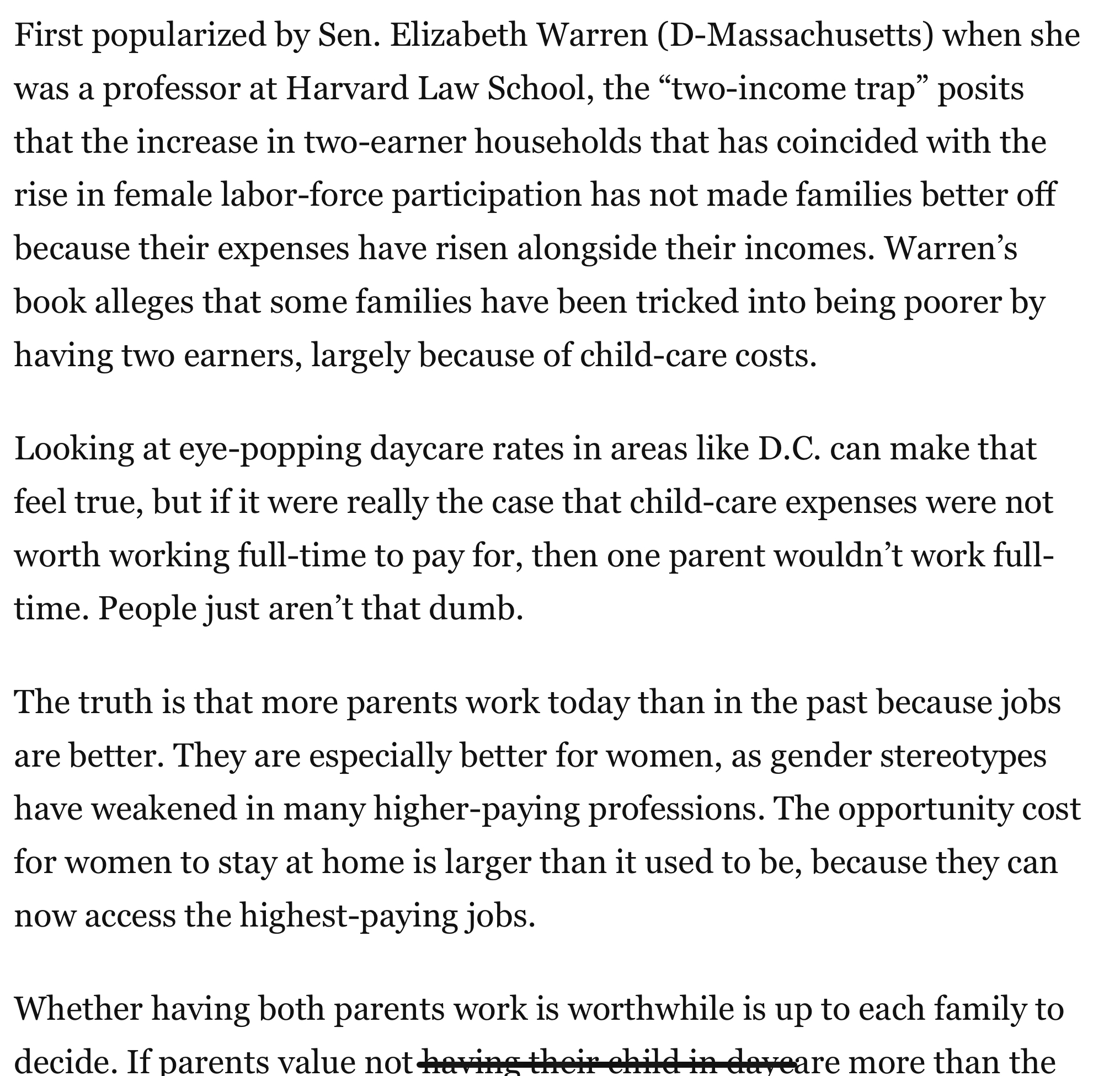 From WaPo's editorial: "Truth is that more parents work today than in the past because jobs are better. Especially for women, as gender stereotypes have weakened..."