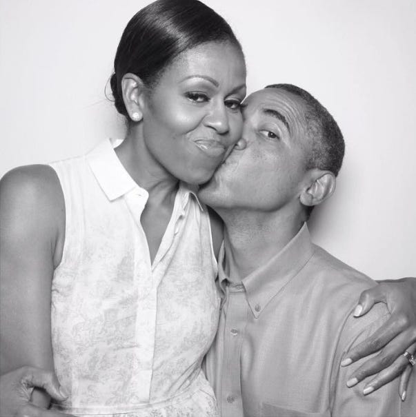 Look at this picture. Barack leaning in, pressing a kiss against Michelle’s cheek like he’s still grateful she ever said yes. Michelle holding it with that half-smile, the kind of smile a Black woman gives when she knows she is both loved and seen.