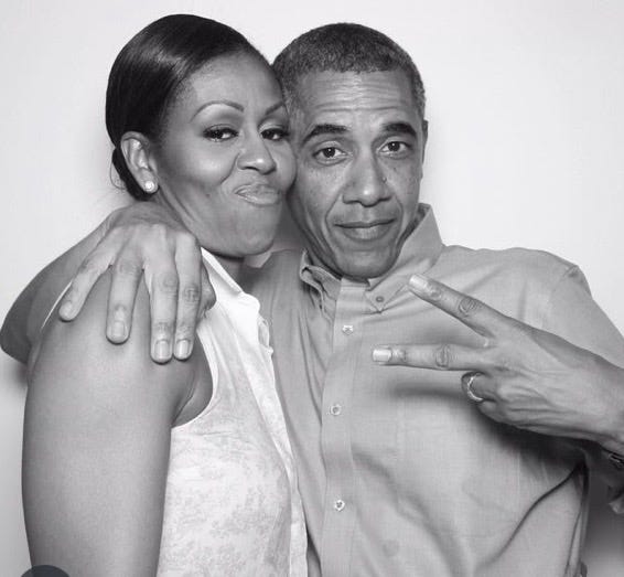 But we can’t stay in the terror alone. If all we do is rehearse the fear, we’ll forget how to breathe. That’s why I come back here. I come back to Barack and Michelle, back to the sweetness. Look at this photo: her half-smirk, his peace sign, their shoulders pressed together like two kids still in on a joke the rest of us don’t get.