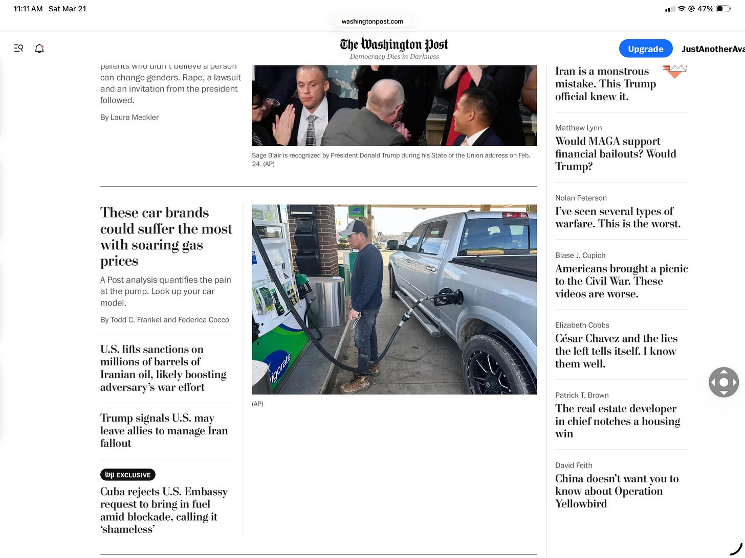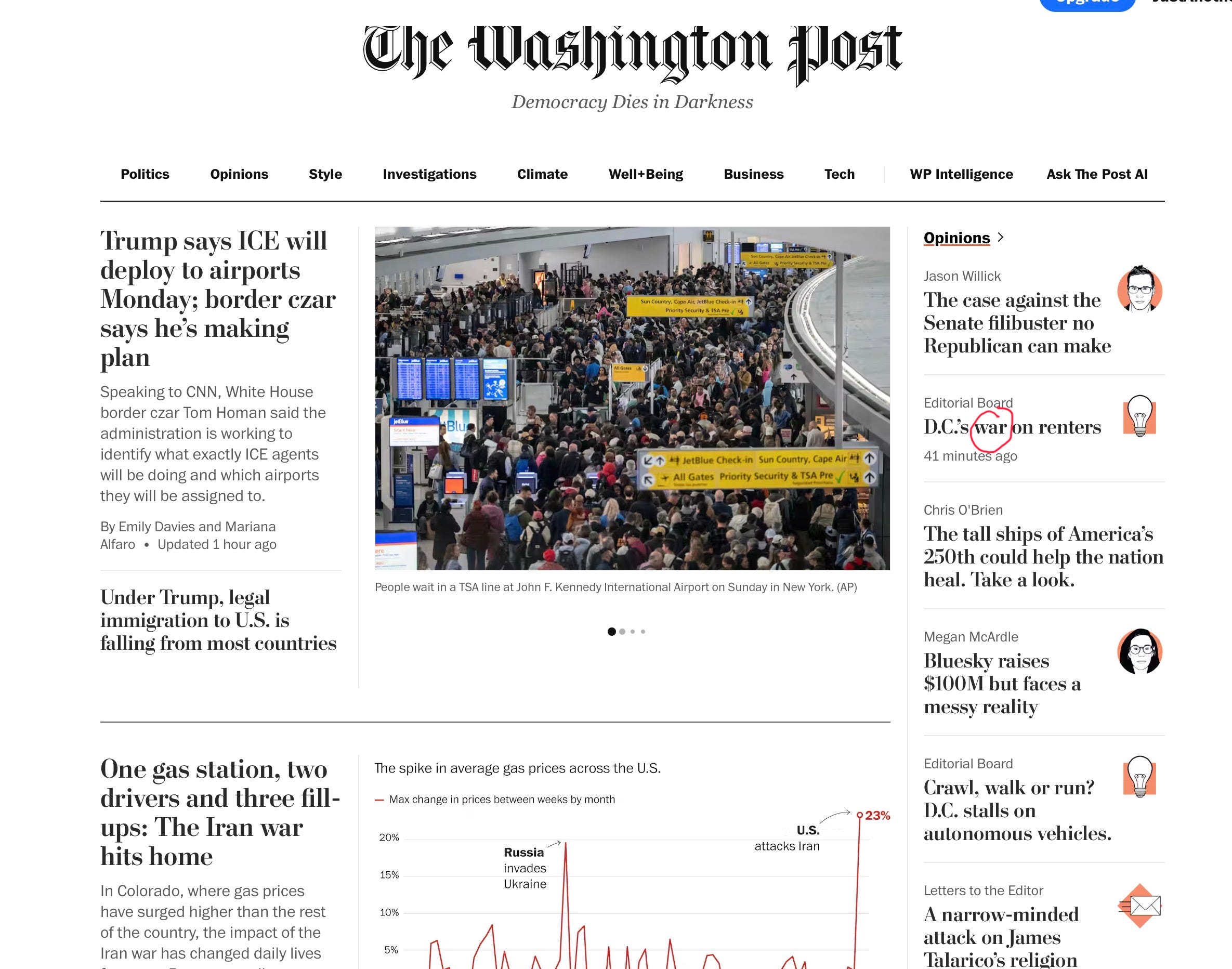 What did they put up top instead? ICE at airports. Big headline. Big crowd photo. Big visual panic. Fair enough, that is news. But once again the page was telling me, before I even scrolled, what kind of emergency I was supposed to feel in my ribs. Then, lower down, there it was: “One gas station, two drivers and three fill-ups: The Iran war hits home.” Not the war hits the region. Not the war hits the world. Not America is in a fourth-week military conflict with Iran. No. The war hits home because gas is high. We have got missiles flying and the homepage is greeting the event like it is a damn Groupon problem. [5]