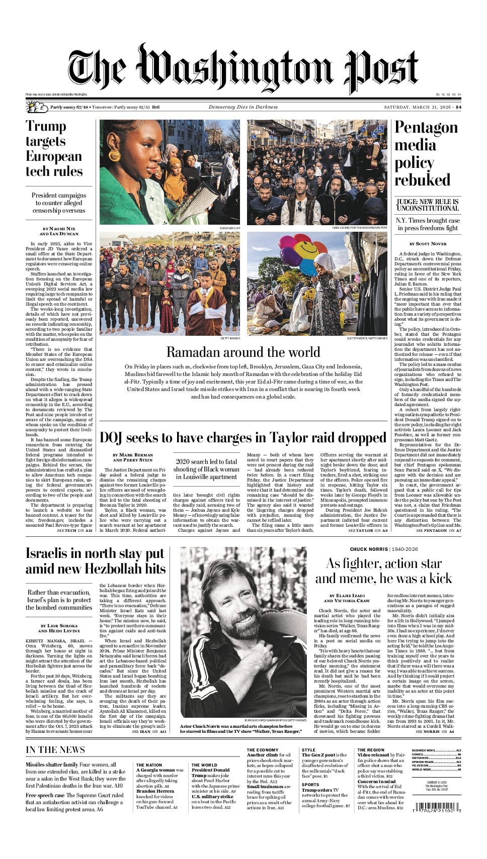 Same date. Same paper. Same little magic trick. Different tailoring. The print front page did not scream war either. It gave major play to Trump targeting European tech rules, a Pentagon media-policy rebuke, and a big center photo package called “Ramadan around the world.” And let me be clear: there is nothing wrong with covering Ramadan around the world. The problem is not that those stories existed. The problem is the ranking. The problem is that the biggest brute fact of the day, an ongoing war involving the United States and Iran, still could not bully its way into commanding the page like an actual damn war.