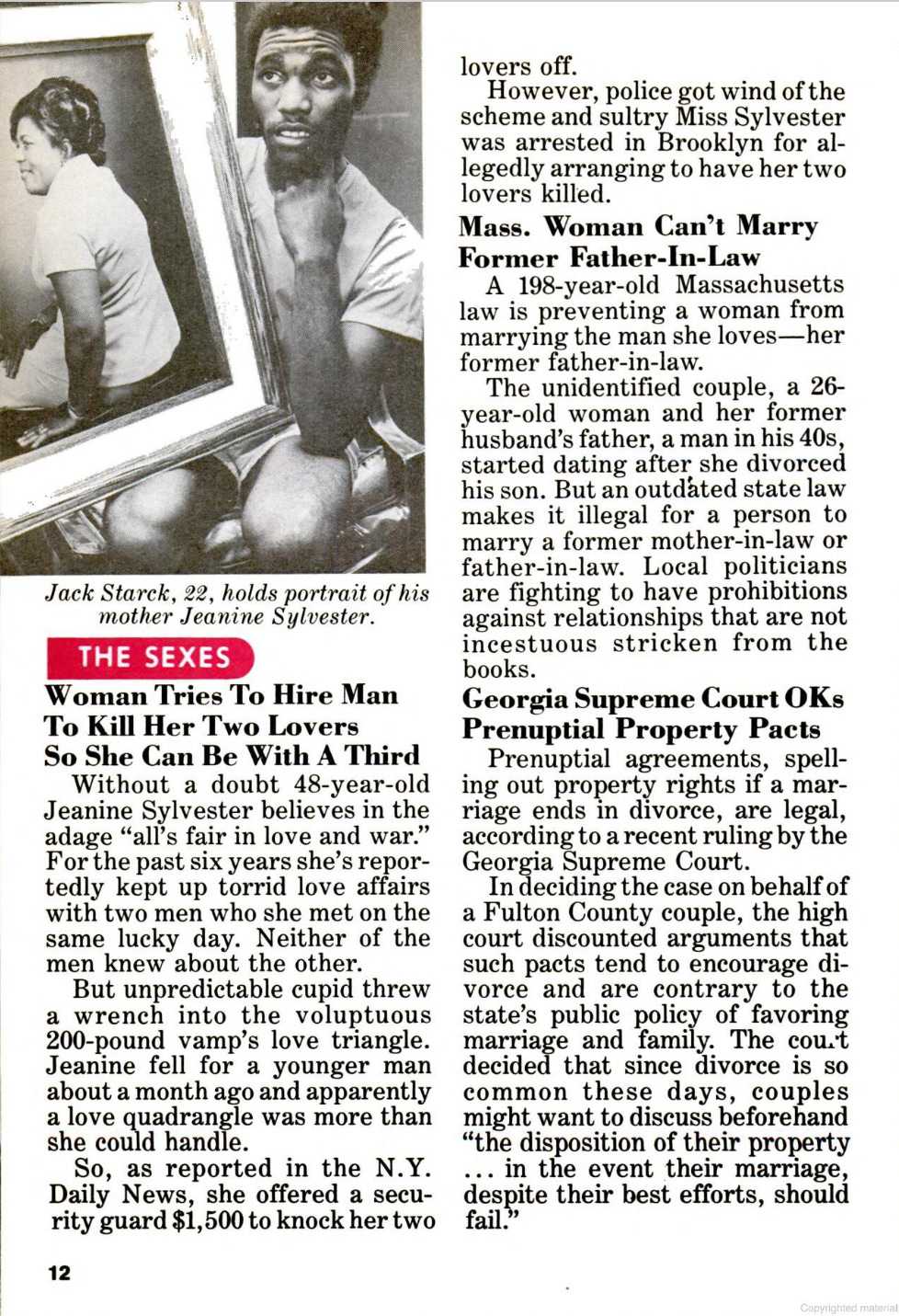 First, the Semicid page said plain: Black women are setting terms on sex and timing. Cheap, discreet control you can order by mail. Because autonomy got practical in ’82. Now flip to “The Sexes.” The wild murder-for-hire story is tabloidy, but its job is cultural policing. It screams, “female desire out of bounds,” so the audience gets a cautionary tale. Because when women gain leverage, the first response is often panic stories about what happens when they use it “too far.”