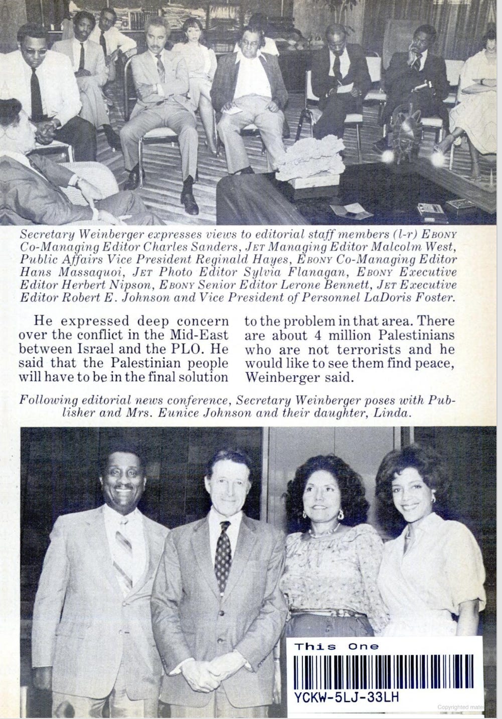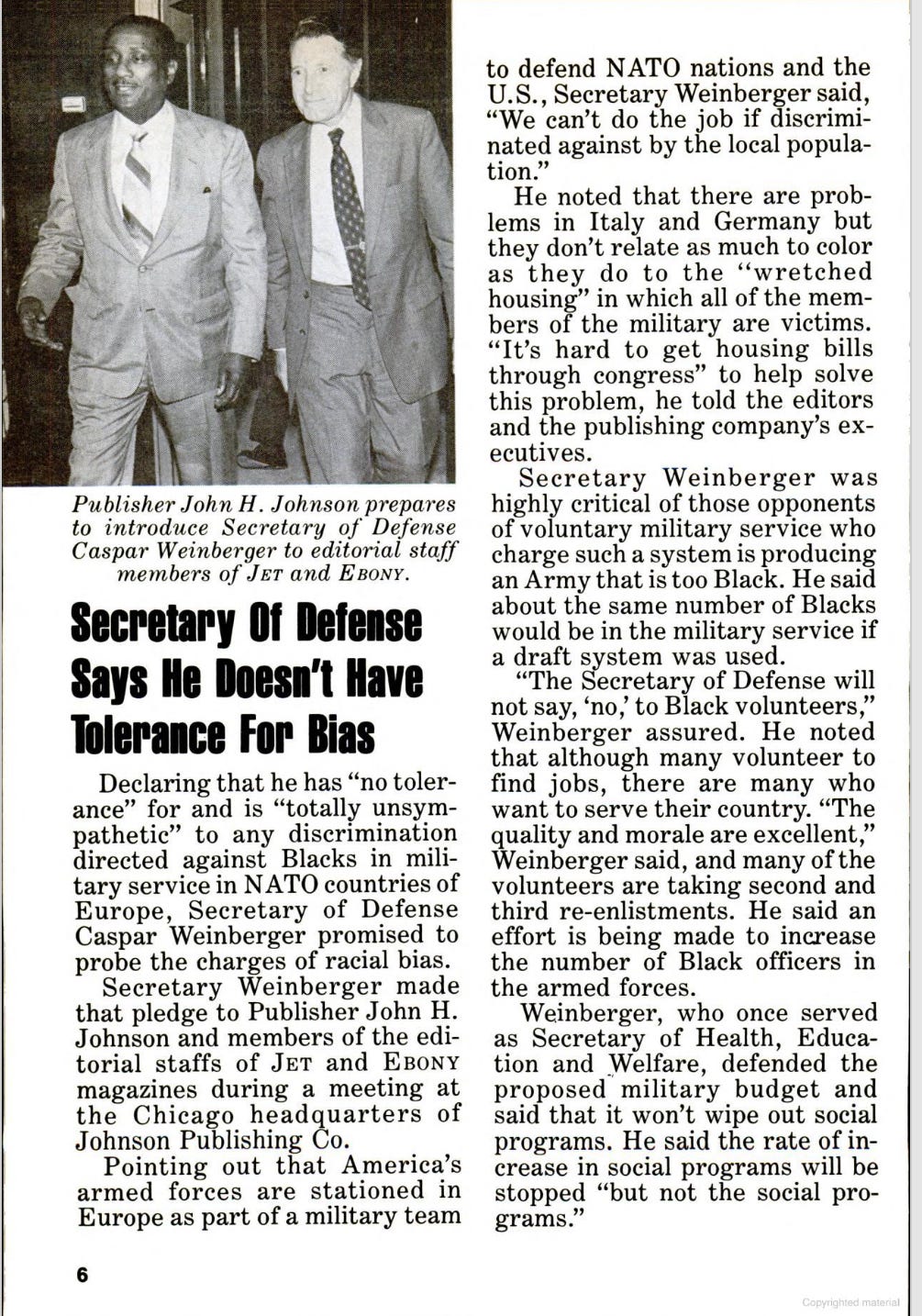 Look at this page. John H. Johnson brings in Defense Secretary Caspar Weinberger to talk straight to Jet and Ebony. Weinberger says “no tolerance” for bias, promises to probe discrimination, says the housing for troops is “wretched” and needs help, and, crucially, pledges to grow Black officers. He defends the budget but adds they won’t wipe out social programs. That’s a Republican cabinet official, in Black media, saying inclusion out loud.