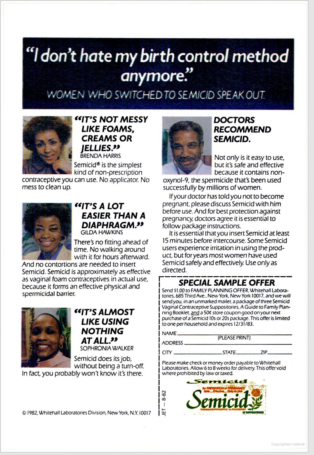 The ad is 1982, speaking in women’s voices about a cheap, discreet, mail-order spermicide. No doctor visit. No applicator. Shows up in an unmarked envelope. That is control you can hold in your hand. It normalizes Black women setting terms for sex, timing, and family planning in the middle of a tight economy.