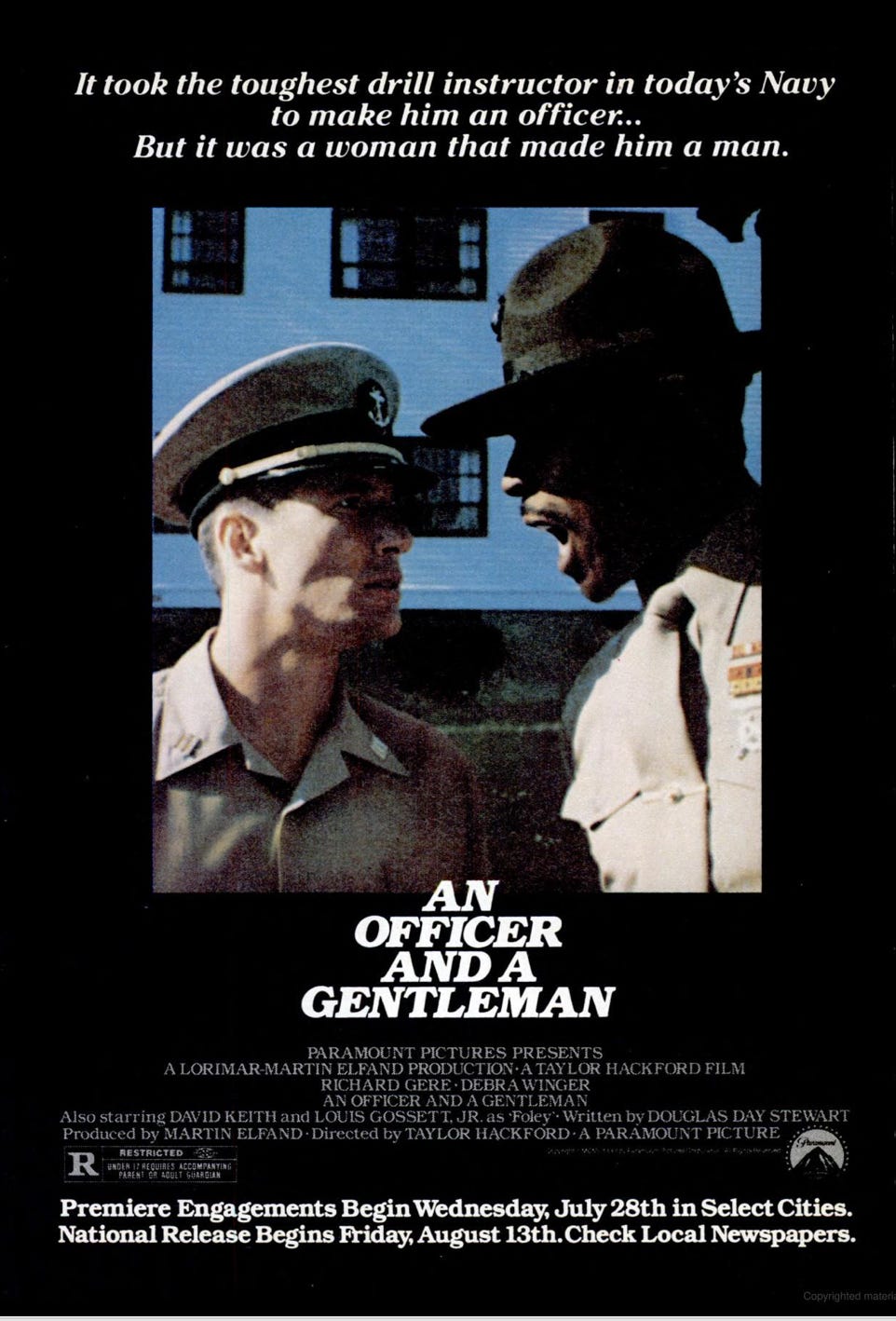 Now fold in the house. Debra Winger’s factory worker isn’t a muse. She has terms. The tagline says it plain: manhood is negotiated in intimacy, not just forged on the drill yard. That rhymes with the Semicid ad and the prenup ruling. Women setting the clock. Contracts named out loud. The bedroom becomes the place where promotion meets commitment.