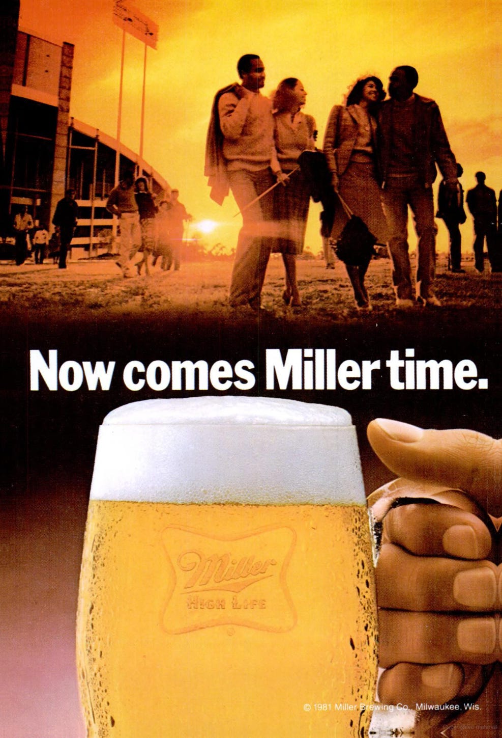 The next page has the sun low. Stadium lights tall. Couples strolling out in their work-casual best. In the foreground a giant cold mug, hand wrapped tight, foam high like reward. Bottom corner says 1982. The copy is a promise: you did your hours. Here’s your relief.