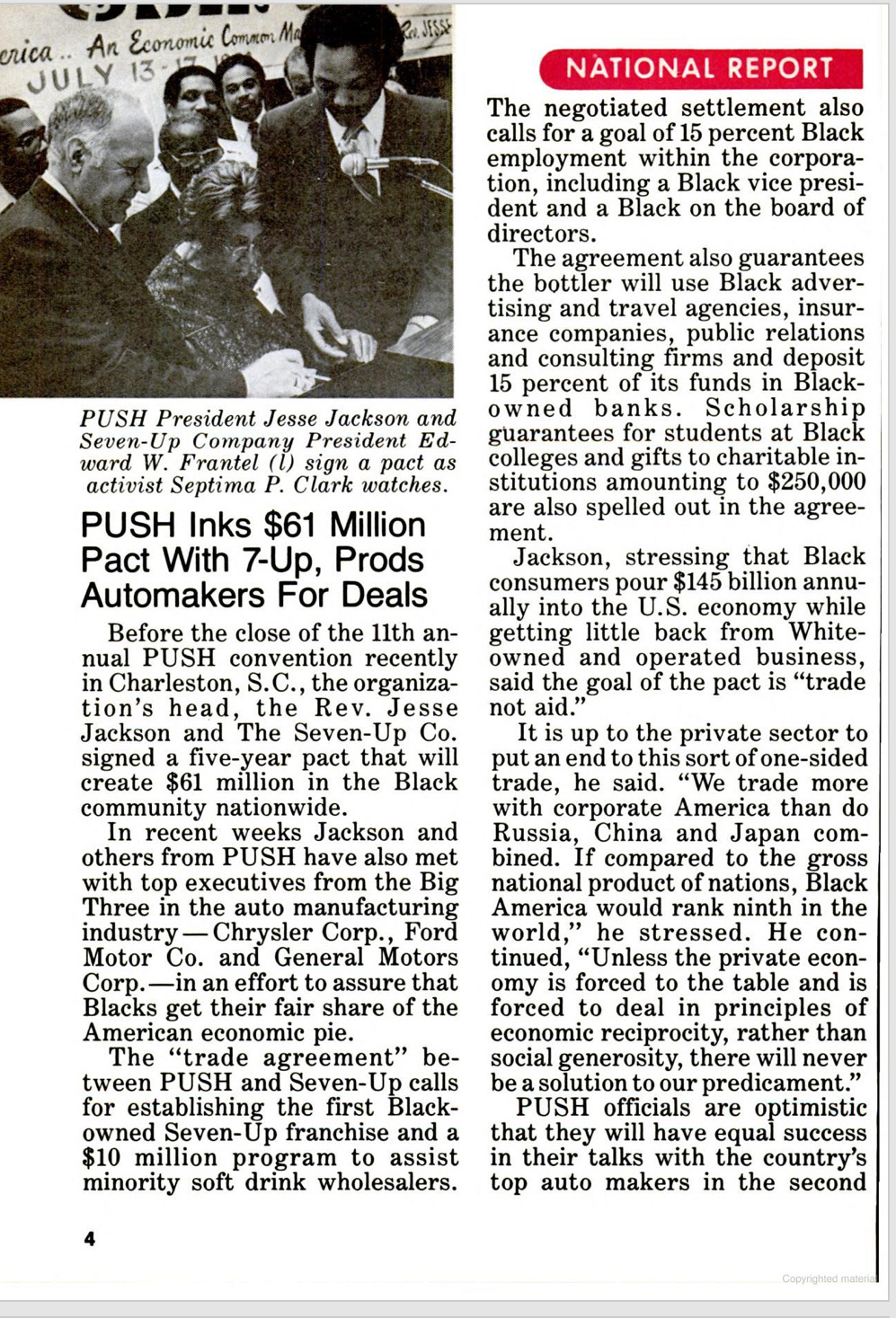 This Jet spread shows an economic playbook, not a vibe check. A civil-rights org signs a five-year pact with a soda company that routes real money and power: a 15 percent Black employment goal including leadership seats, Black-owned ad and travel agencies in the vendor stack, 15 percent of deposits into Black-owned banks, scholarships for HBCU students, the first Black-owned franchise, and a $10 million program to back minority wholesalers. Because Black consumers are pouring serious dollars into the economy, the deal says some of that flow must come back through Black institutions.