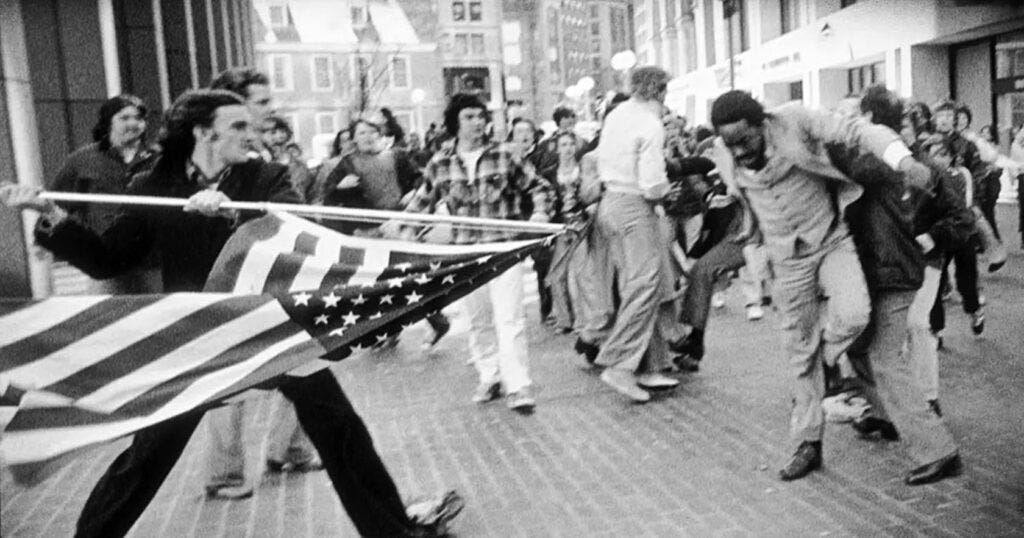 Look at the first picture above. A flag becomes a spear in a city block. That is not a metaphor. That is anti-busing rage in broad daylight, aimed at a Black body for daring to move through public space. This is the undertow the A-side could not carry.