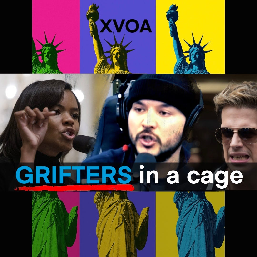 Psychologically, this is what happens when a movement built on outrage discovers there’s more money in fighting each other than in fighting us. Tim’s whole rant is basically: “You’re grifting too hard and you’re going to break the toy we all use.” Candace’s whole clapback is: “You’re just mad I’m better at this game than you are.” And hanging over all of it is that special episode of Timcast where he brings on Milo Yiannopoulos and George Santos—the chaos twins themselves—to “debate” the Candace/TPUSA drama like it’s the State of the Union. That’s not a serious movement; that’s reality TV with Bible verses and body armor. When your “civil war” features a beanie, a ring light, and two influencers yelling “grifter” at the mirror, the tigers in the valley aren’t hunting anybody else. They’re just mauling each other for views.