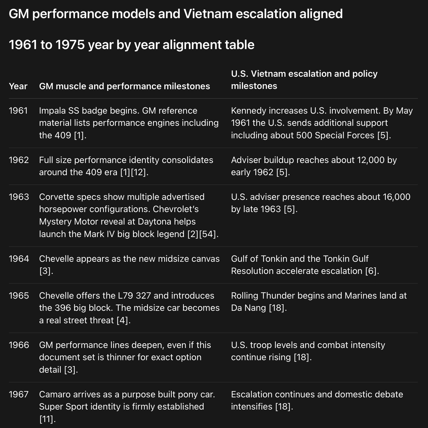 The oh crap realization hit me when I started laying the timelines next to each other. The muscle car era and the Vietnam era do not just overlap. They move with eerie symmetry. Just as Detroit was learning how to drop bigger engines into midsize bodies and sell raw horsepower as freedom, the United States was deepening its military involvement in Vietnam and selling firepower as strategy. The Impala SS arrives in 1961 just as Kennedy expands U.S. involvement in Vietnam. The Chevelle appears in 1964 as Gulf of Tonkin opens the floodgates. By 1965, Chevrolet is dropping the 396 into the Chevelle as Rolling Thunder begins and Marines land at Da Nang. By 1970, the Chevelle SS 454, Camaro Z28, and redesigned Corvette arrive at the very moment the war widens into Cambodia. By 1975, catalytic converters and the collapse of the old street monsters sit on one side of the ledger while Saigon falls on the other [1][4][5][6][15][21].