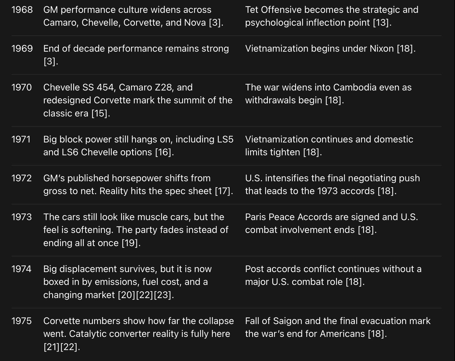 And then the comedown arrives in both worlds. In the car world, emissions rules, fuel shocks, catalytic converters, and new measurement standards bring the fantasy down to earth [17][22][23]. In the war, the body count logic rots, the client state comes apart, and Saigon falls anyway [18].