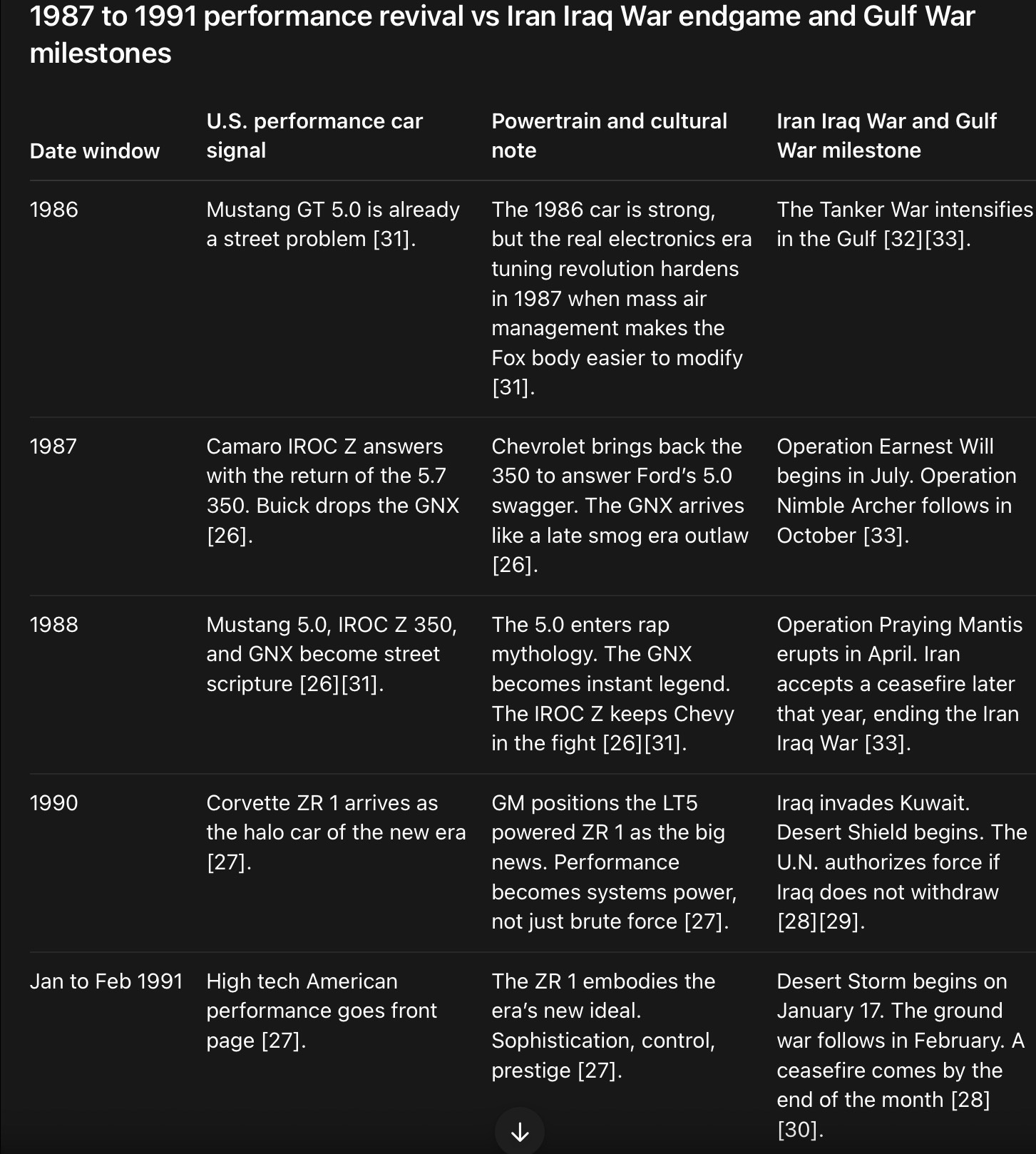 The late 1980s return of the Mustang 5.0, Camaro IROC Z 350, GNX, and later the ZR 1 mirrored America’s post Vietnam attempt to believe power had come back smarter, cleaner, and under control [26][27][28][33].