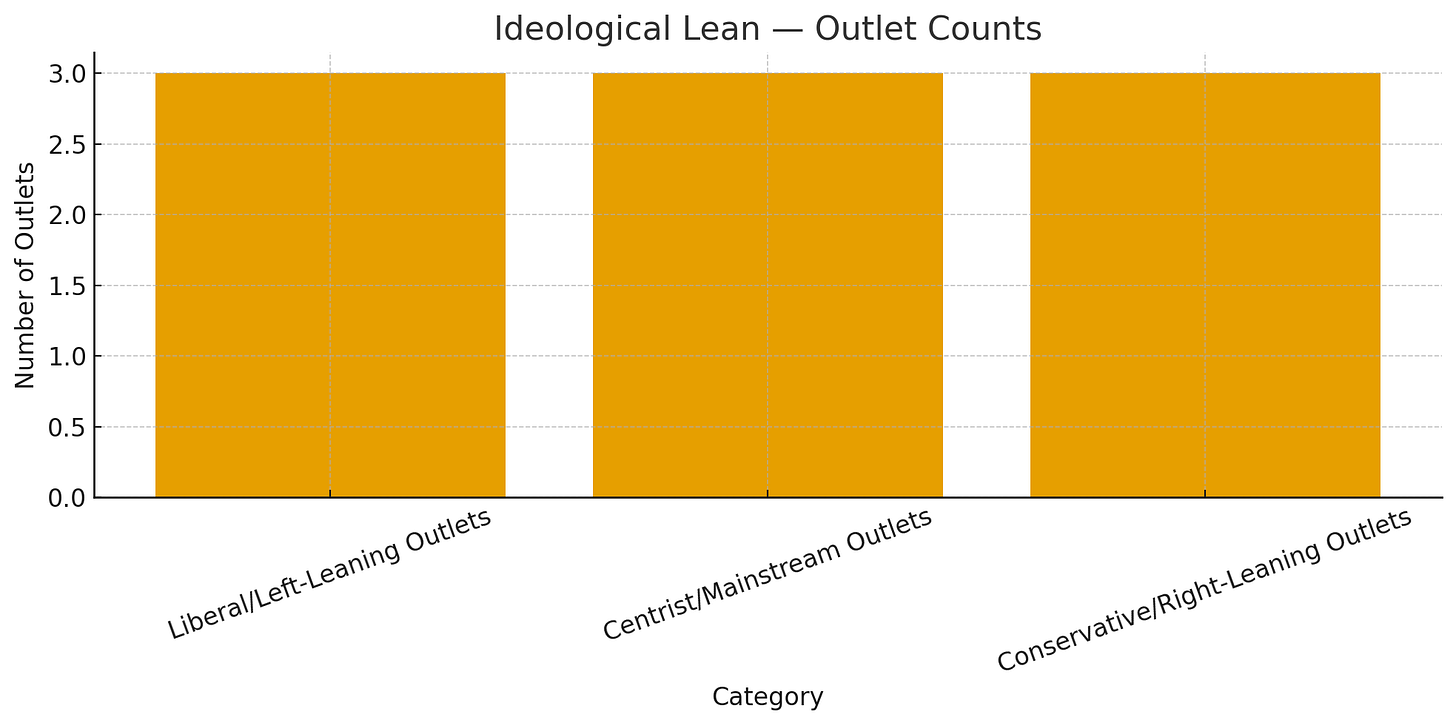 This bar chart shows how many outlets I sampled from each ideological lane: left, center, and right. It’s not a map of all media, just the mix used in this analysis. The goal is to make clear that the story you just read isn’t “one side vs the other,” but a comparison across three distinct information bubbles.
