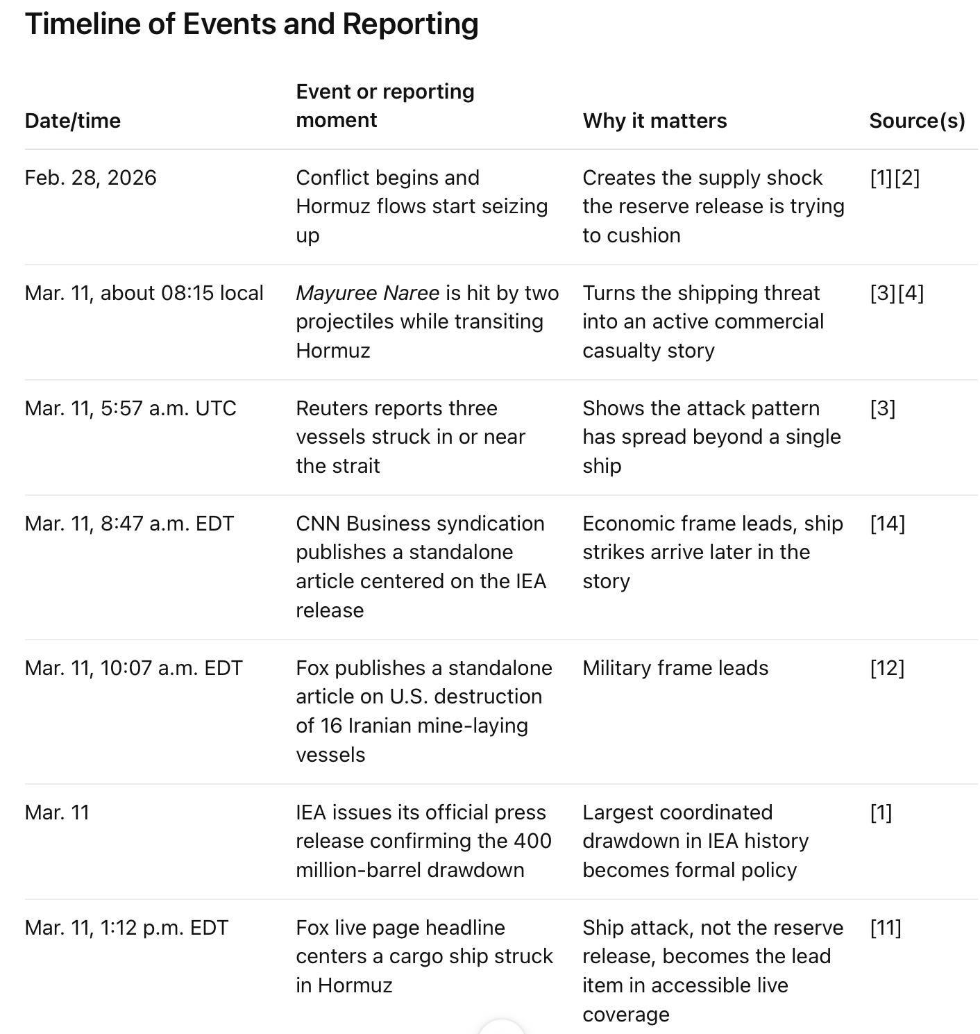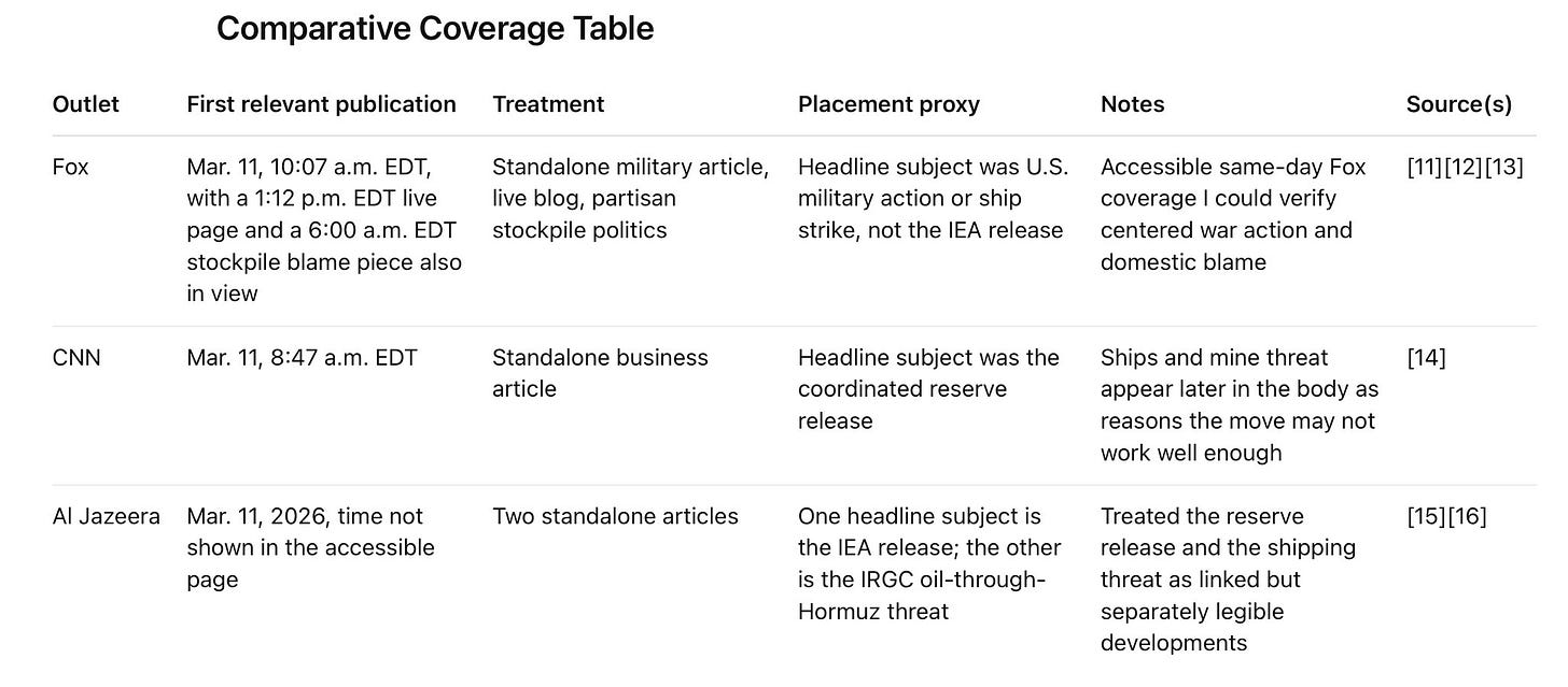 That difference matters because it changes the reader’s mental model. Are you looking at an economic shock that governments are struggling to buffer, or are you looking at a war story with fuel prices attached? CNN and Al Jazeera made the emergency release legible as the central policy response. Fox’s accessible pages made the strait a military and partisan story first [11][12][13][14][15][16].