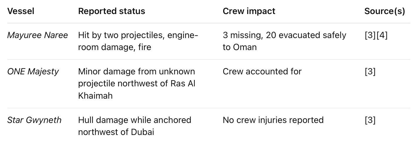 Three vessels were hit on Wednesday, including the Thai-flagged Mayuree Naree, whose operator said it was struck by two projectiles, caught fire, and left three crew members missing [3][4].