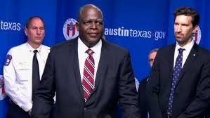 Austin’s fire chief. Black. Bald. Leather jacket. The kind of brother who shows up to a press conference looking like he just left one.