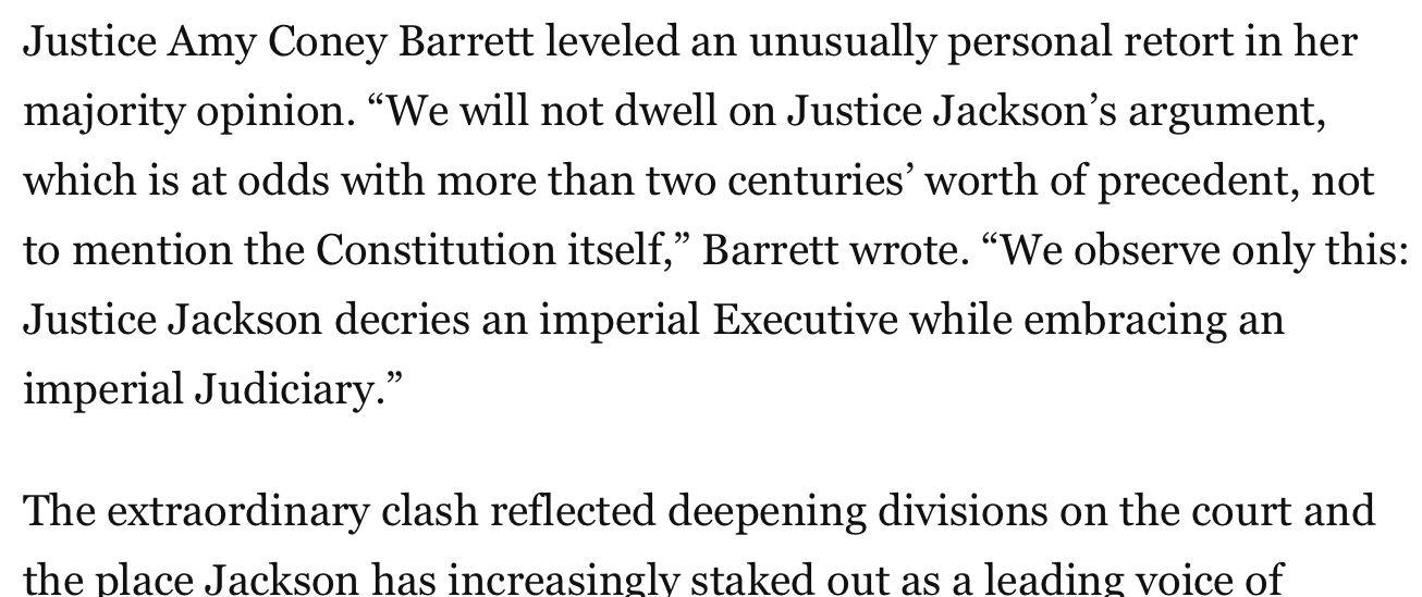 “We will not dwell on Justice Jackson’s argument, which is at odds with more than two centuries’ worth of precedent, not to mention the Constitution itself,” Barrett wrote. “We observe only this: Justice Jackson decries an imperial Executive while embracing an imperial Judiciary.”