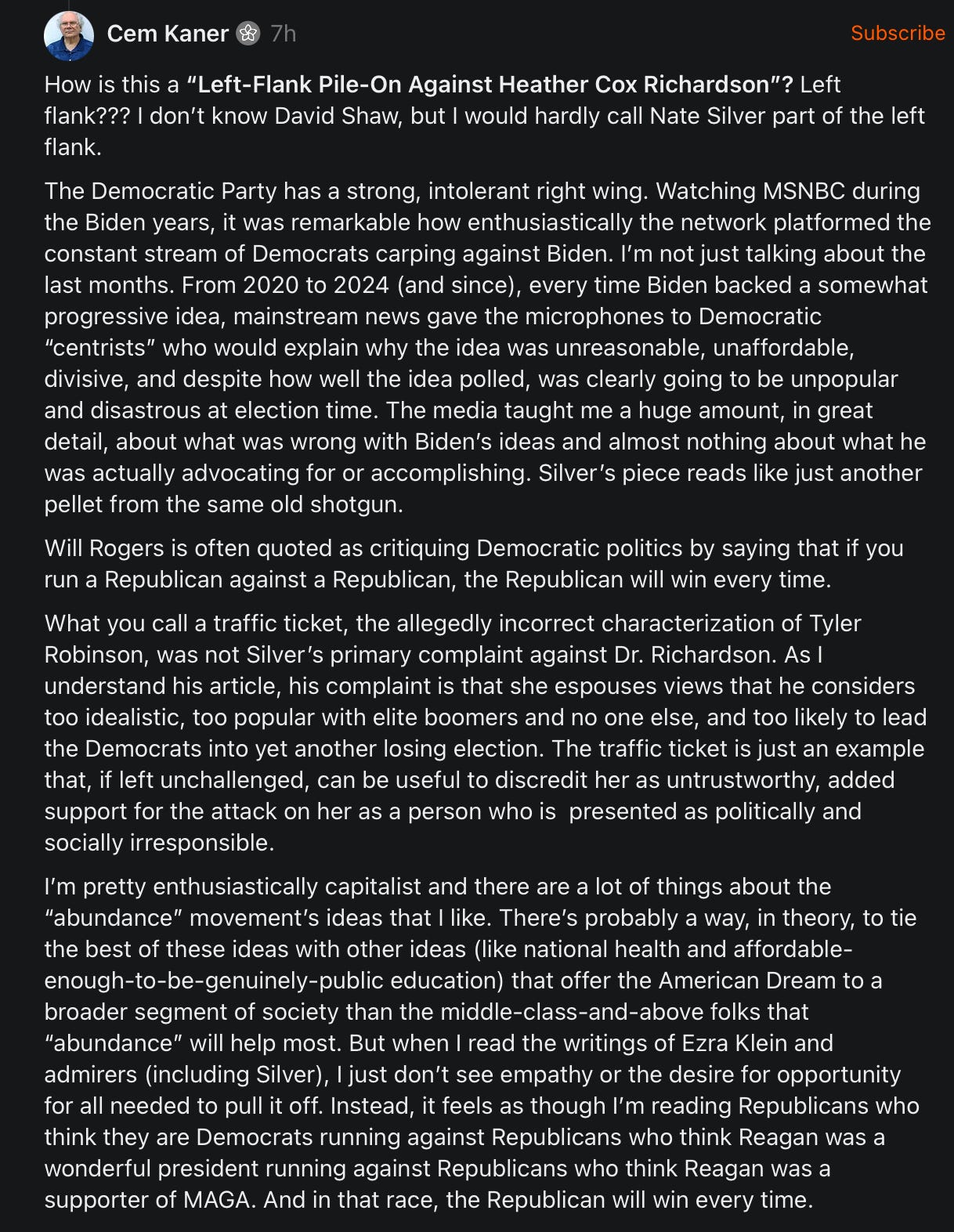 Thank you for this response to Nate Silver’s piece. I was furious when I read it and I’m sad to hear it’s caused her pain. We are all trying to drink news from a firehose, it’s messy to say the least. As for dividing Democrats into warring factions, we have always been a big tent full of contradictions. This is not a weakness, it’s a strength when we can harness it.