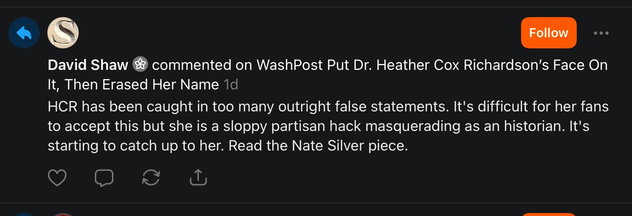 “How is this a ‘Left-Flank Pile-On Against Heather Cox Richardson’? Left flank??? I don’t know David Shaw, but I would hardly call Nate Silver part of the left flank.”